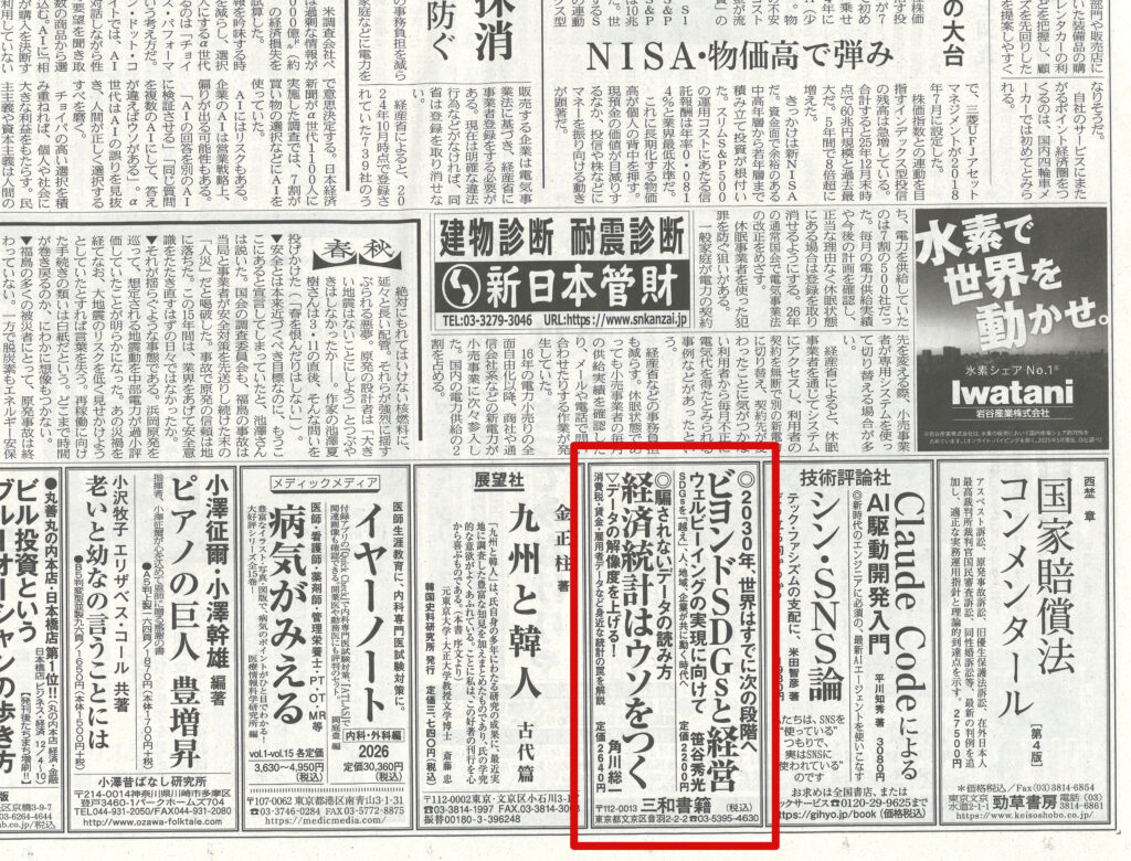 1月8日、日本経済新聞1面サンヤツに『ビヨンドSDGsと経営』『経済統計はウソをつく』が掲載されました。