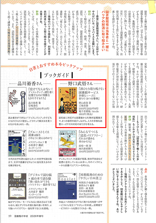 3月19日発行の、『図書館の学校 2026年春号』で『誰ひとり取り残さない図書館サービス』掲載されました。 著者である野口武悟先生の対談も掲載されています。