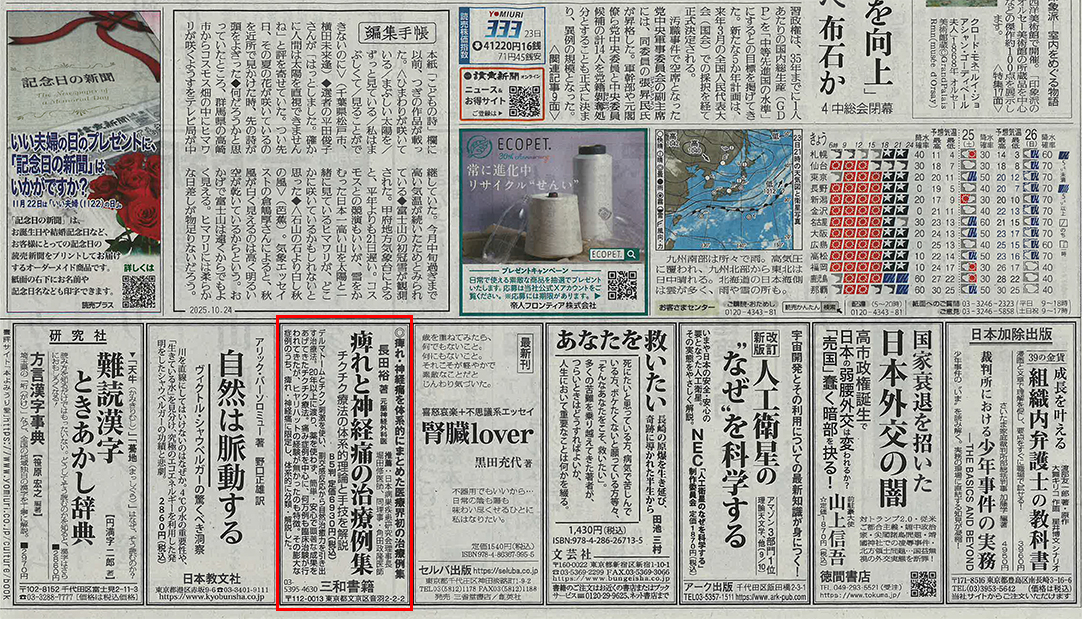 10月24日、読売新聞1面に『痺れと神経痛の治療例集』が掲載されました。