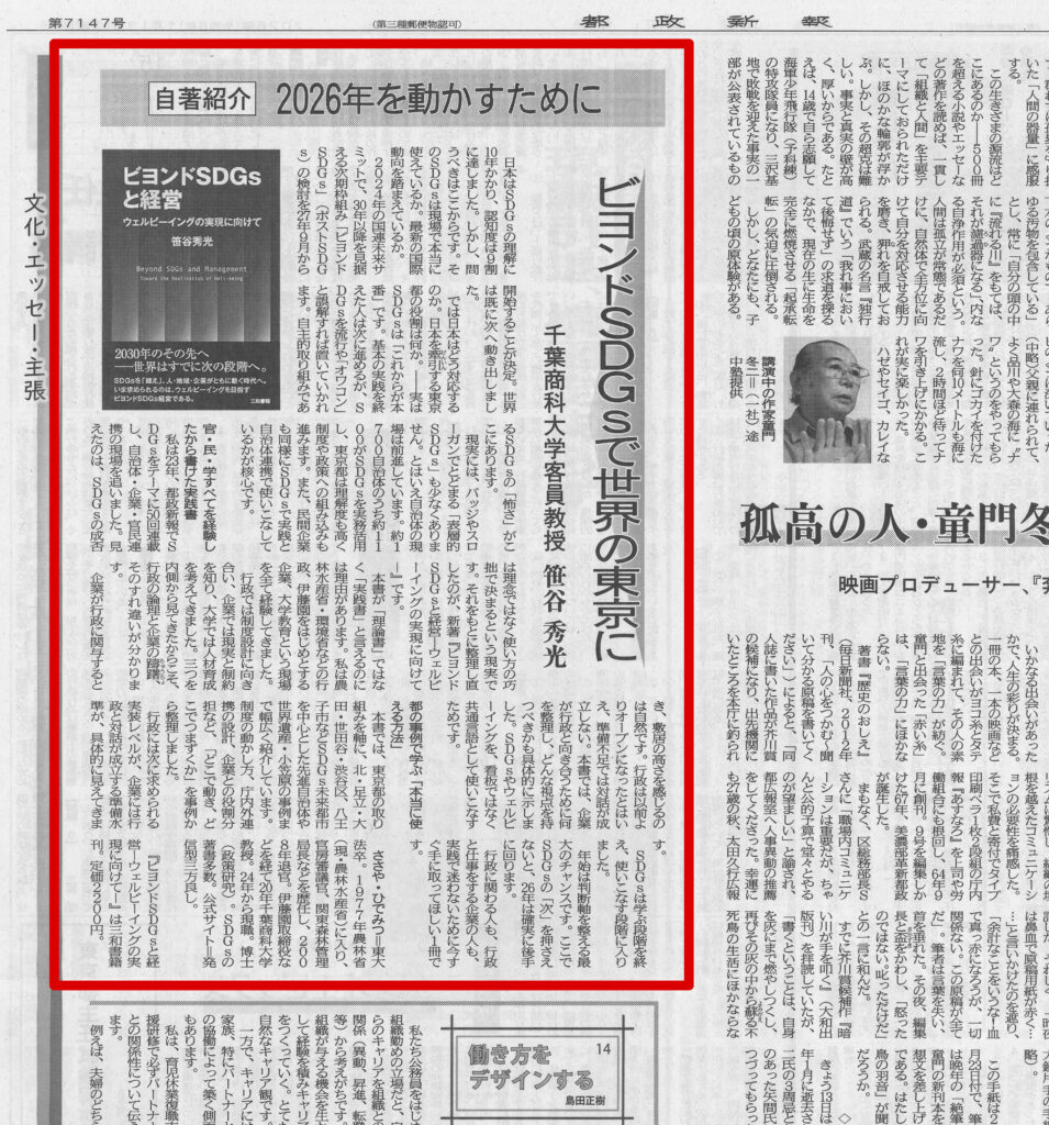 1月13日の『都政新報』に『ビヨンドSDGsと経営』の自著紹介が掲載されました。