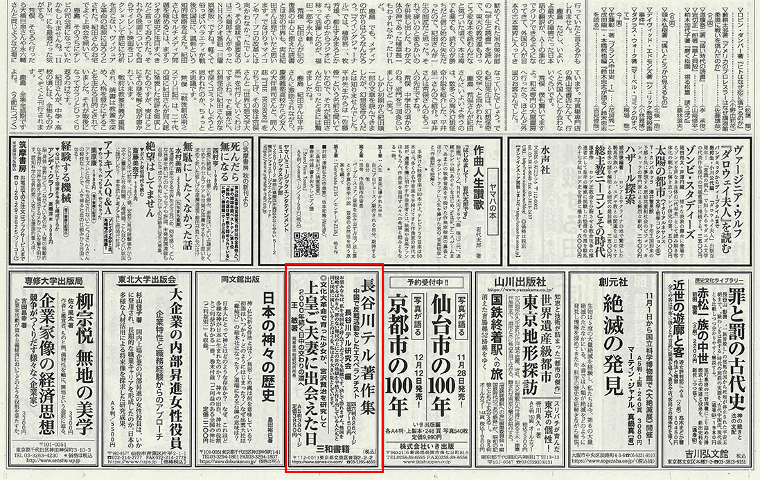 10月31日、「週刊読書人」1面広告欄に『長谷川テル著作集』『上皇ご夫妻に出会えた日』が掲載されました。